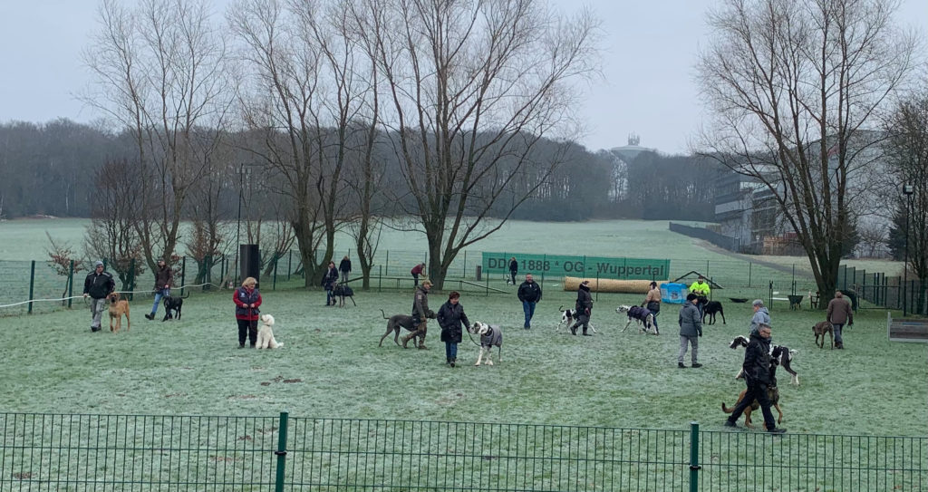 Heute hatten wir echt volle Hütte – 2 Dutzen Doggenfreunde zum Sonntags-Frühstück und 14 Hunde in der ersten Runde auf dem Platz zum Training .